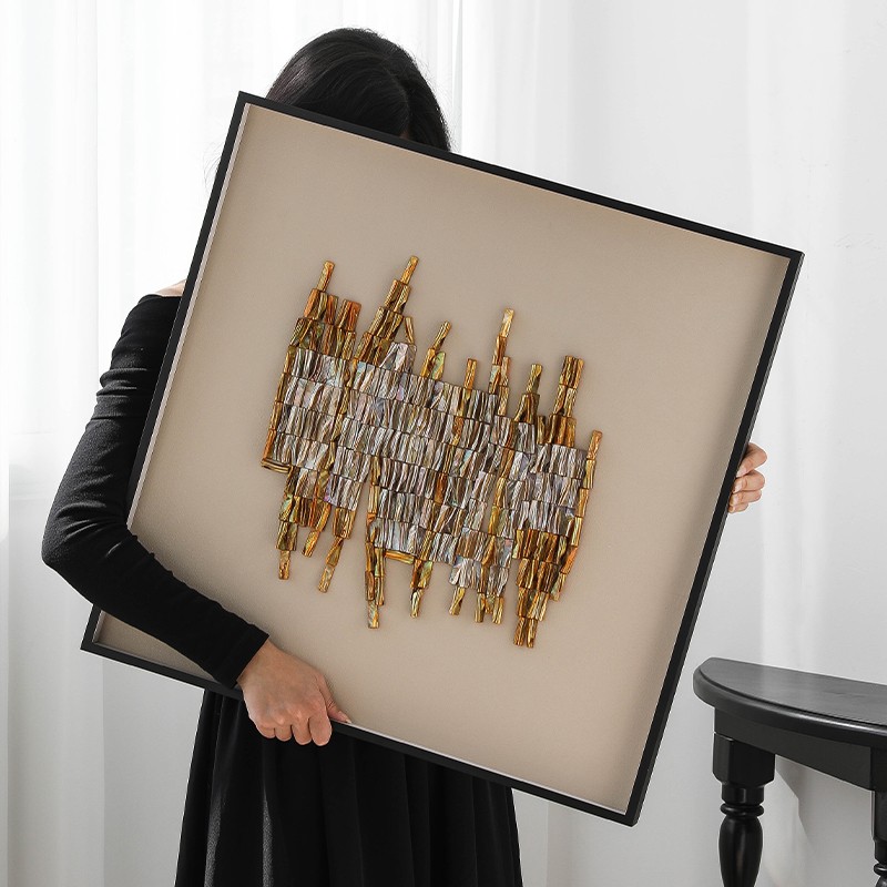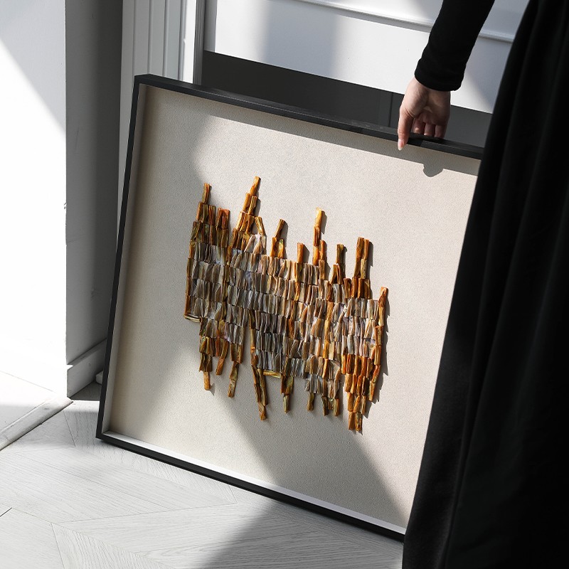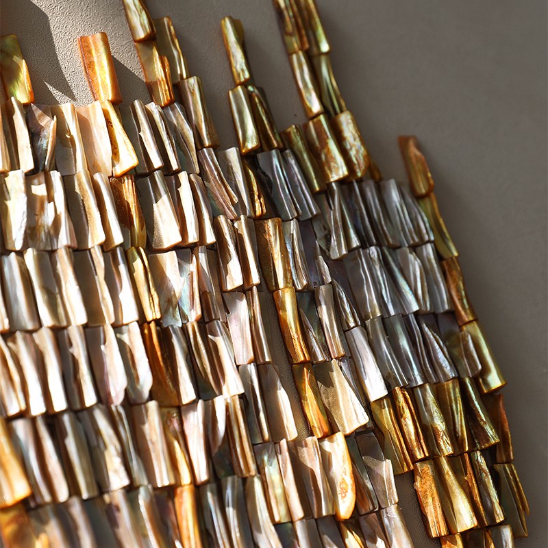 Every piece of natural golden shell is a passionate love letter from the ocean to the earth. With the flowing golden patterns of lava as the brush strokes and the natural golden shells tempered by tides as the bone and blood, this gilded totem burning in the deep blue abyss is created.